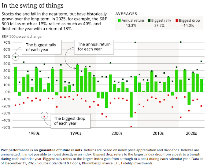 “Since 1980, the S&P 500 Index has experienced a decline of about −14% on average in any given calendar year,” says Naveen Malwal, institutional portfolio manager with Strategic Advisers, LLC, the investment manager for many of Fidelity’s managed accounts. “Yet stocks have normally recovered and finished with average gains of about 13% in any given calendar year, including dividends. So a market decline of −10% or −15% isn’t unusual, nor necessarily a sign that stocks will continue to decline. Market volatility can feel unsettling, but it is normal.”