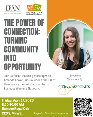 Join the Royal Oak Chamber of Commerce Friday, April 17th at Bamboo Royal Oak to celebrate the Business Women’s Network, hear from Amanda Lewan, co-founder and CEO of Bamboo, and enjoy breakfast sponsored by Gleba and Associates!